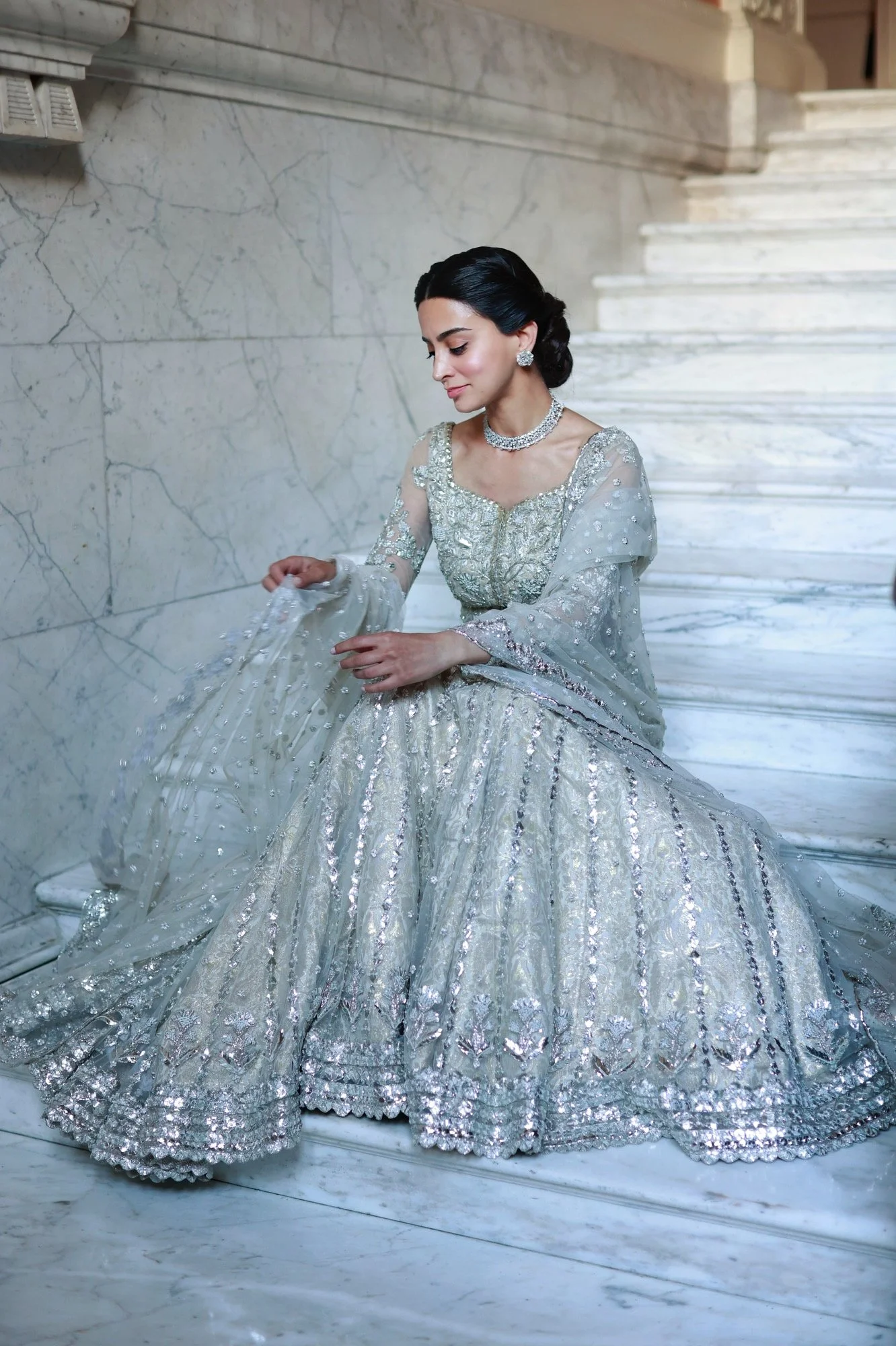 This custom made outfit is one of my favourite pieces. An embellished work of art, this signature ‘lehnga choli’ by Deena Rahman is fully hand embroidered outfit using age-old techniques; ‘gota’, ‘kamdani’, ‘resham’, ‘sitara’ and ‘zardozi’ work combined. Having Deena create a bespoke piece for you is a really special experience. She was wonderful at ensuring the final garment was exactly what I had in mind and that it would fit to perfection. I really wanted some sort of floral embellishment which was incorporated both into the blouse and border of the lehnga.