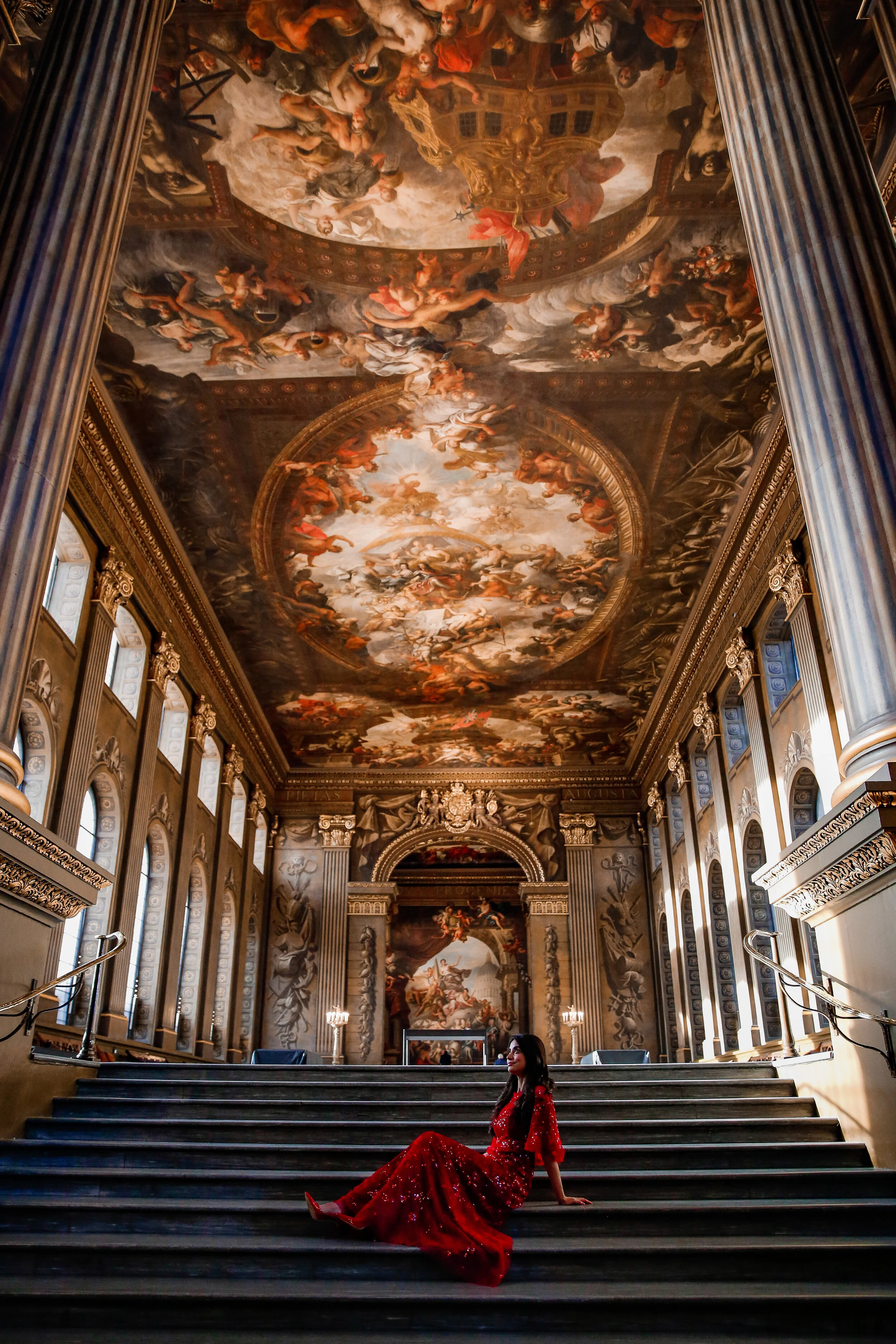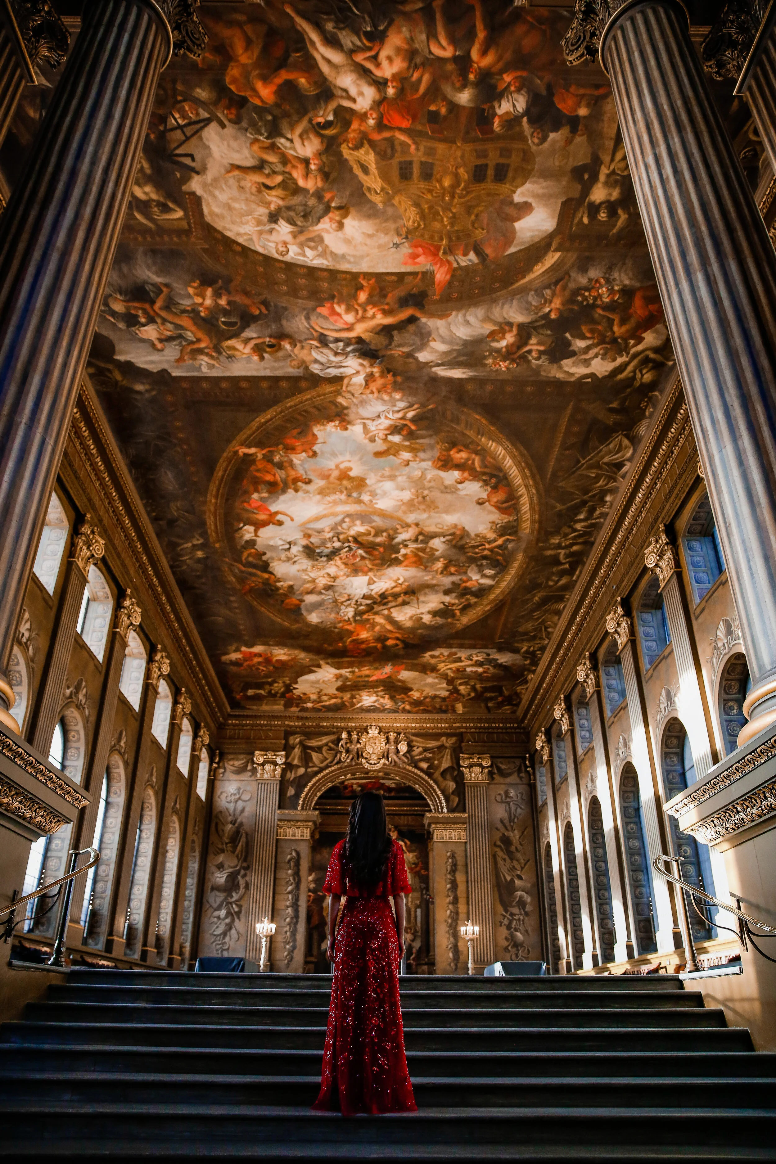 The scale and magnificence of Wren’s outstanding Baroque complex that still stands today, was intended to reflect the wealth and power of Britain as the world’s dominant maritime power. The Painted Hall boasts one of the most spectacular Baroque interiors in Europe. The incredible ceiling and wall decorations were conceived and executed by British artist Sir James Thornhill.